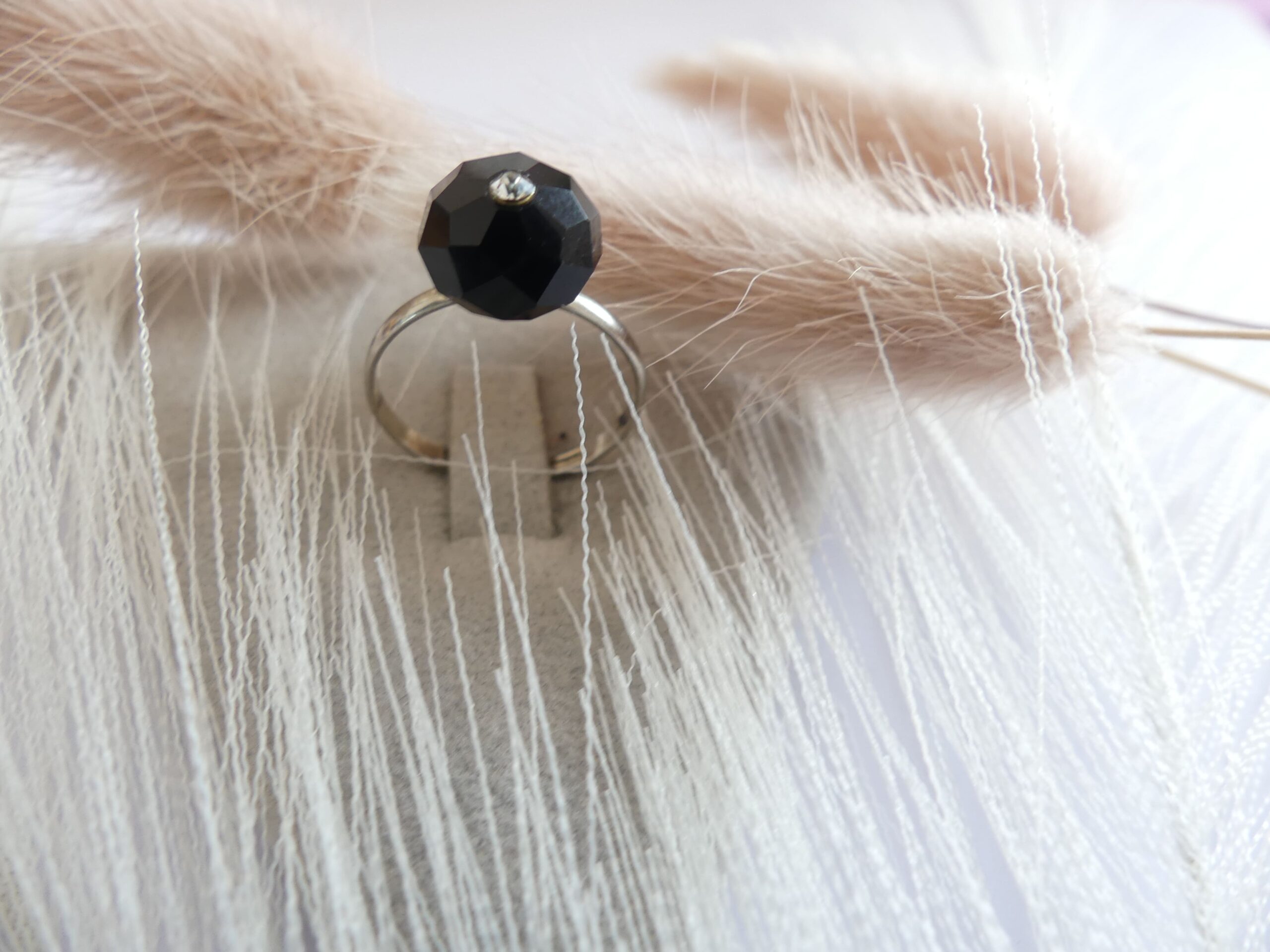 Bague anneau en acier fin et perle noire taillée avec un strass dessus