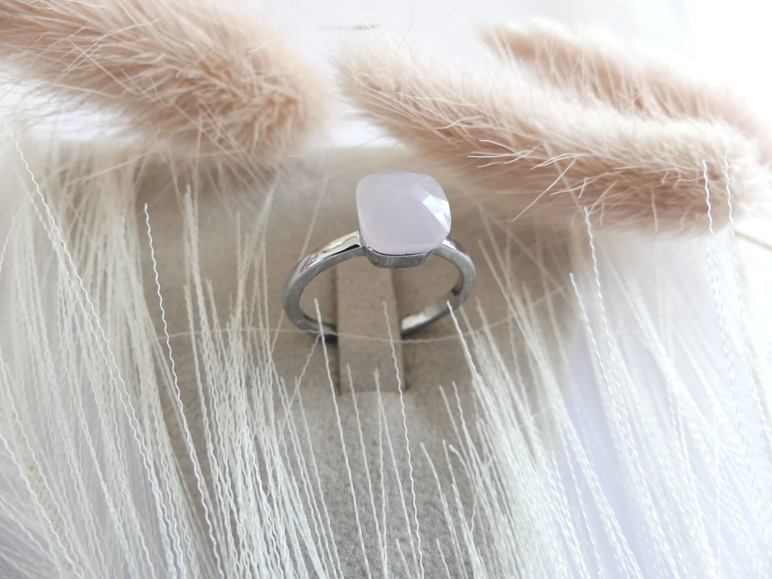 Bague anneau en acier fin et pierre de quartz rose taillée