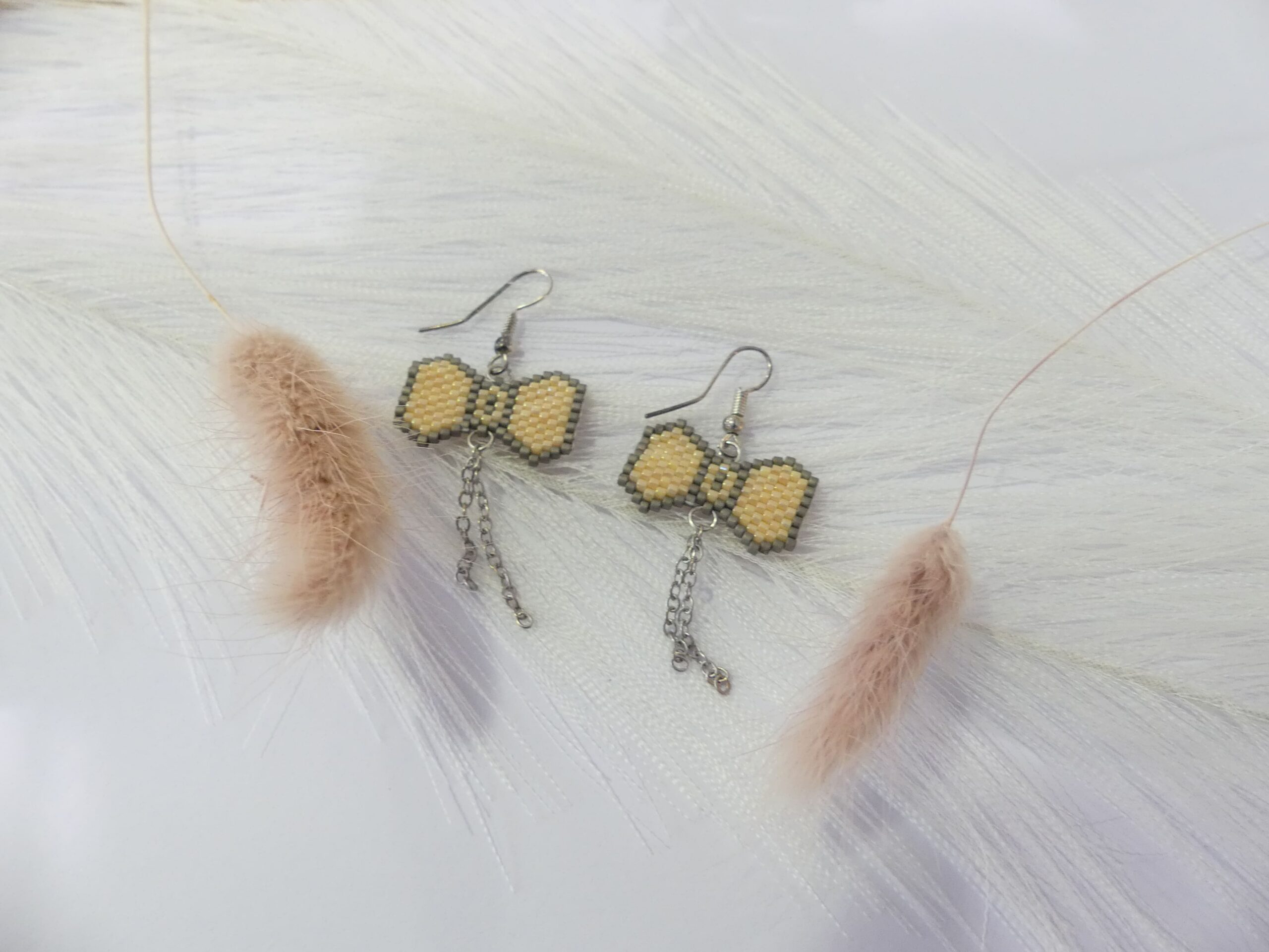 Noeud tissé en perles miyuki crème et une bordure argentée. Les attaches sont en acier. Il y a deux chaines argentées qui pendent