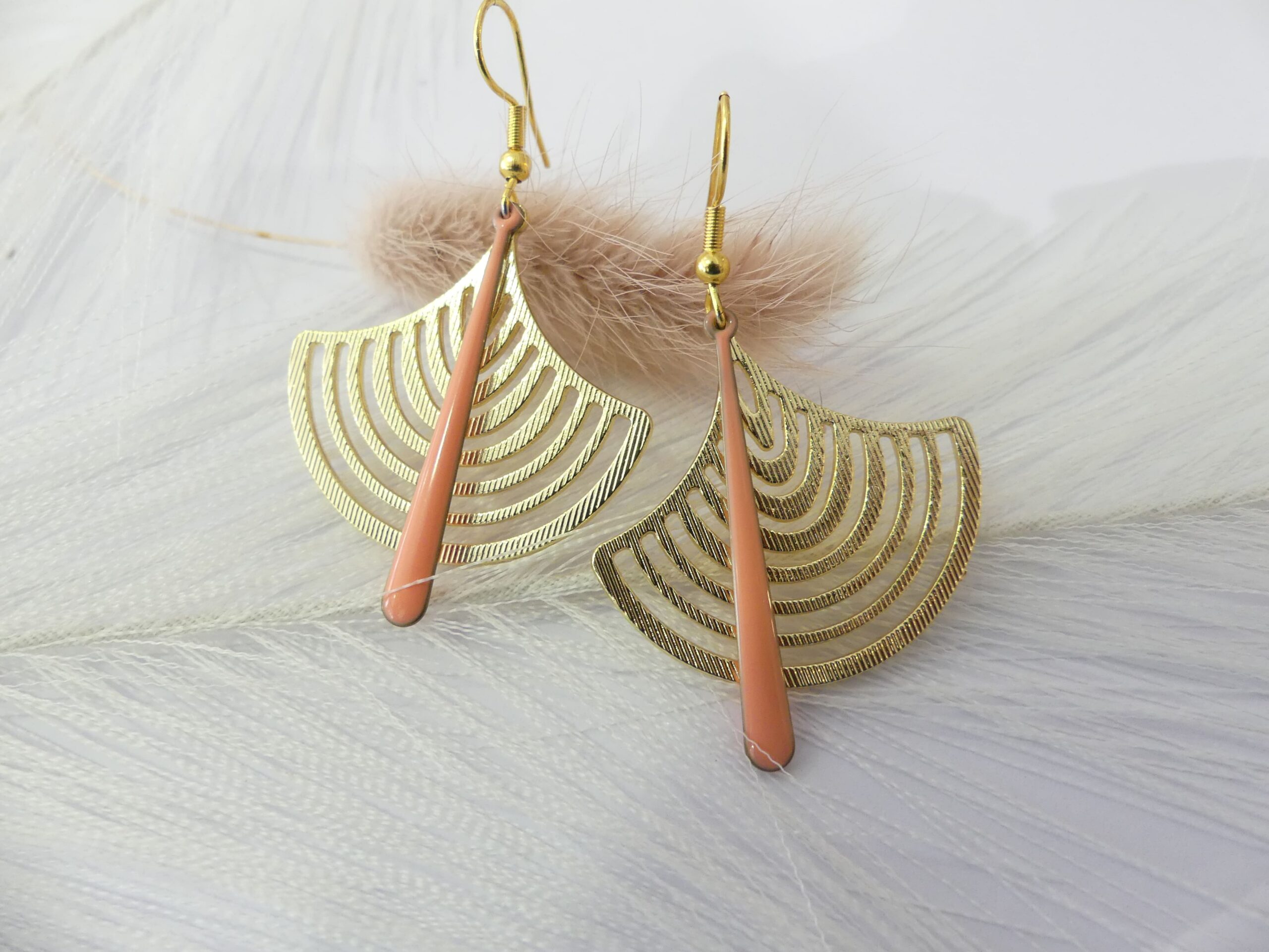 Eventail doré ajouré avec une longue pampille émaillée de càouleur abricot