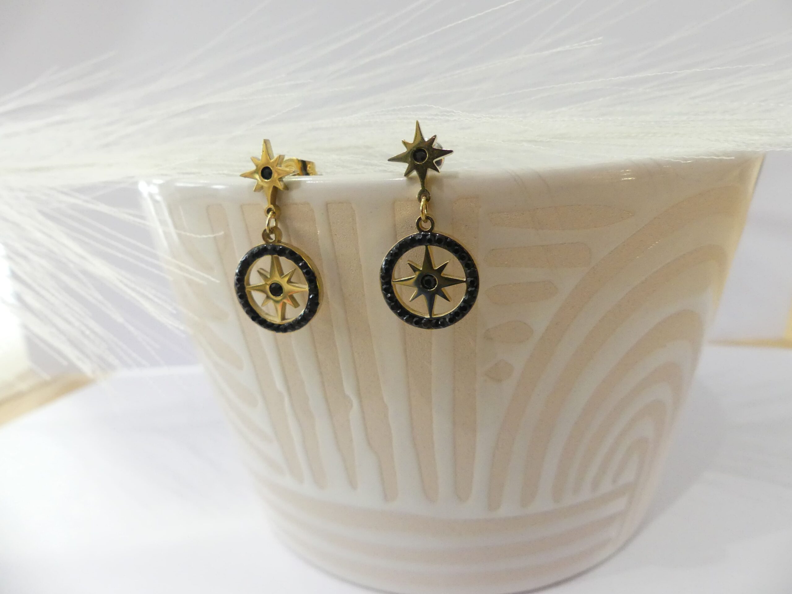 Attaches en acier en forme d'étoile à laquelle est accroché une pastille noire et dorée ajourée avec un motif d'étoile dorée et un strass noirs