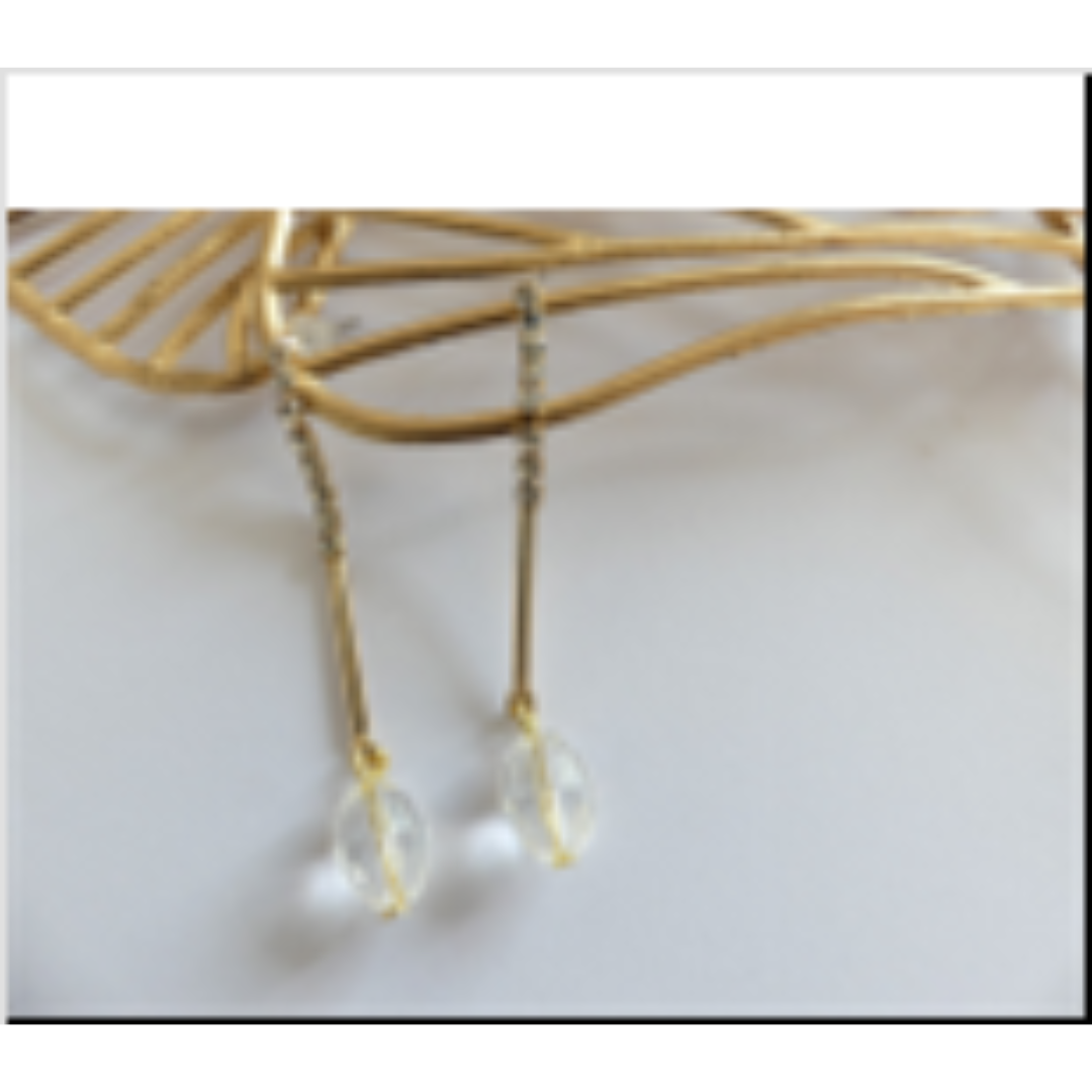 Chainette de strass à laquelle est accroché une tige dorée et une perle en forme de grain de riz en verre transparente