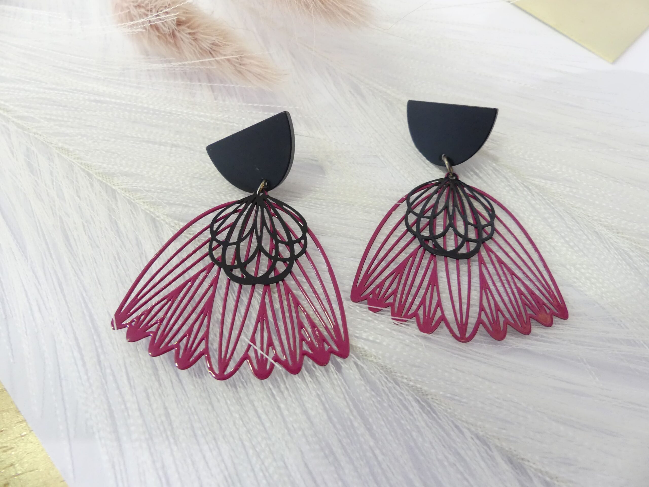 Boucles avec une attache en demi cercle noire et deux pampilles. l'une noire métalique ajourée et l'autre rose.