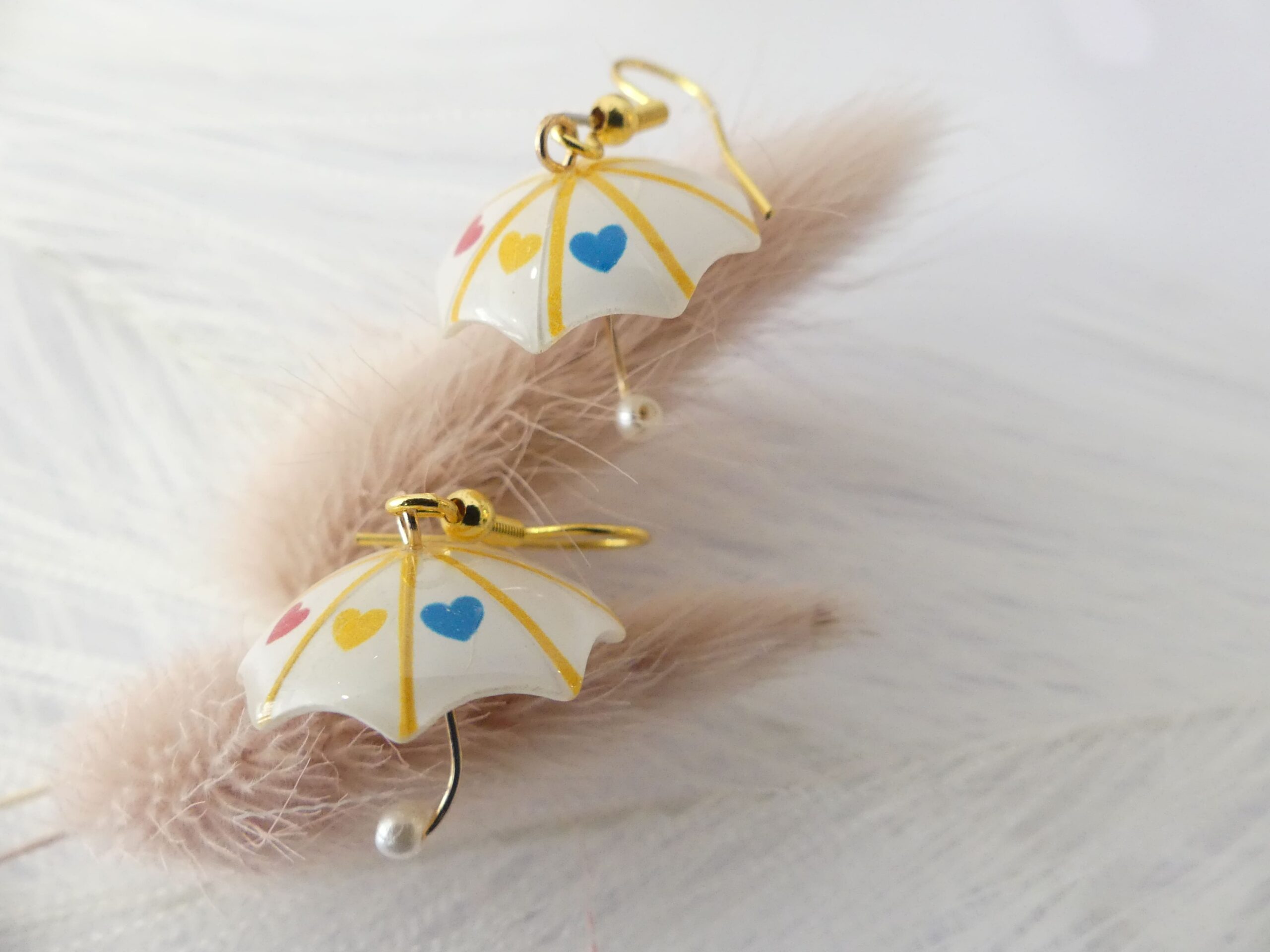 Petit parapluie blanc à armature dorée, et 3 petits cœur bleu, jaune et rouge . L'attache est en acier.