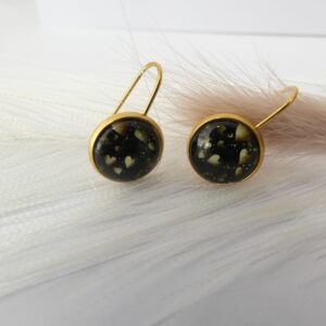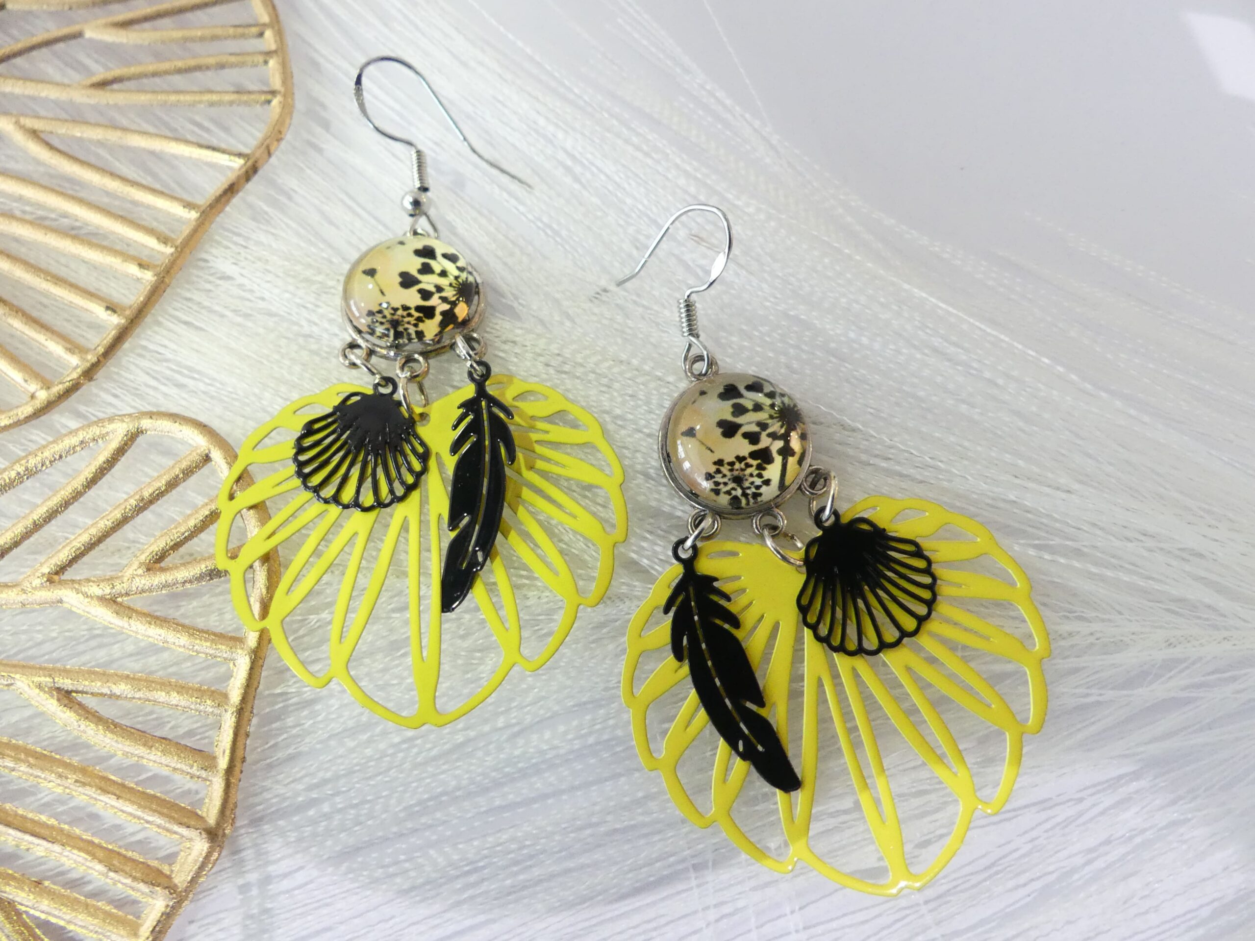 Pampilles feuille jaune, plume noire et coquillage noir en métal ajouré attaché à un cabochon en verre et motif de pissenlit et cœur jaune et noir. Attache en argent. Elles sont légères malgré leur taille