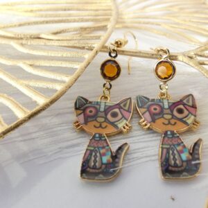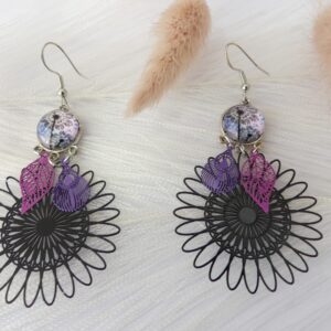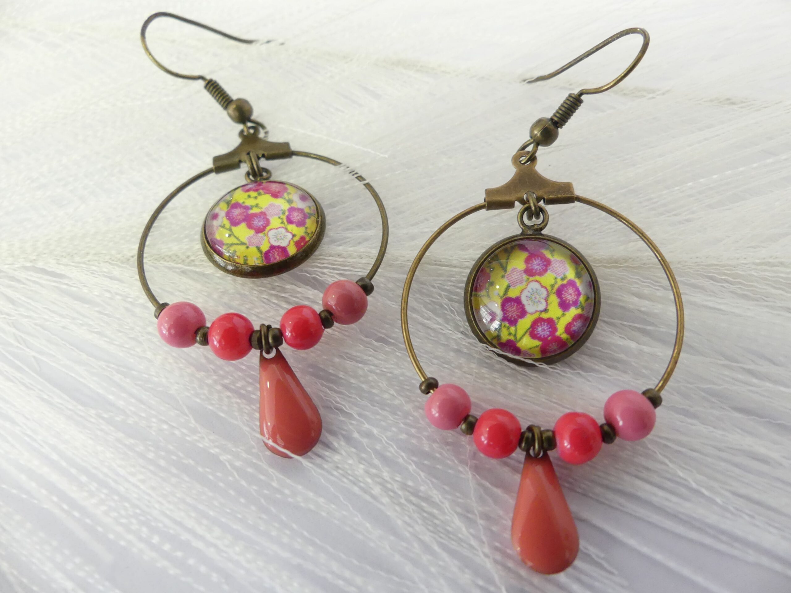 Boucles d'oreilles avec anneaux en bronze 2,6 cm de diamètre cabochon en verre fleuri jaune et rose perles rose et breloque emmaillée rose en forme de goutte