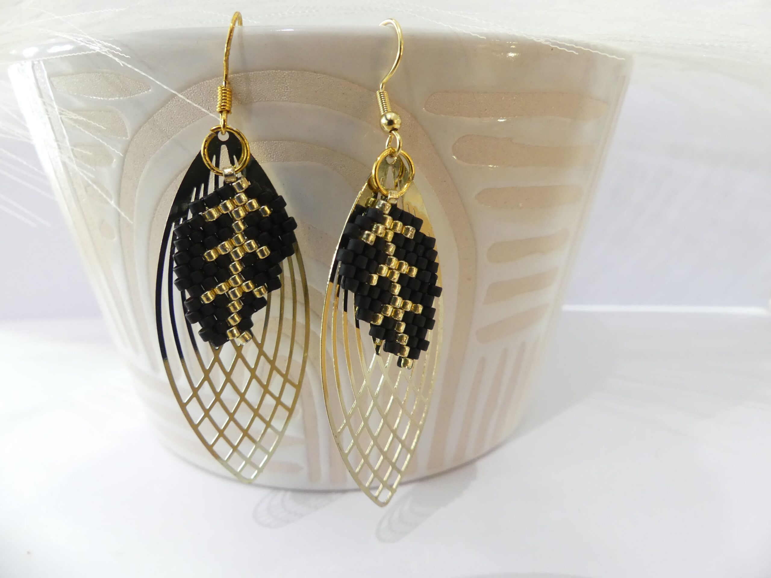 Pampille ajouré en forme de goutte dorée et feuilles tissées en perles Miyuki noires et dorées. Attaches en acier doré