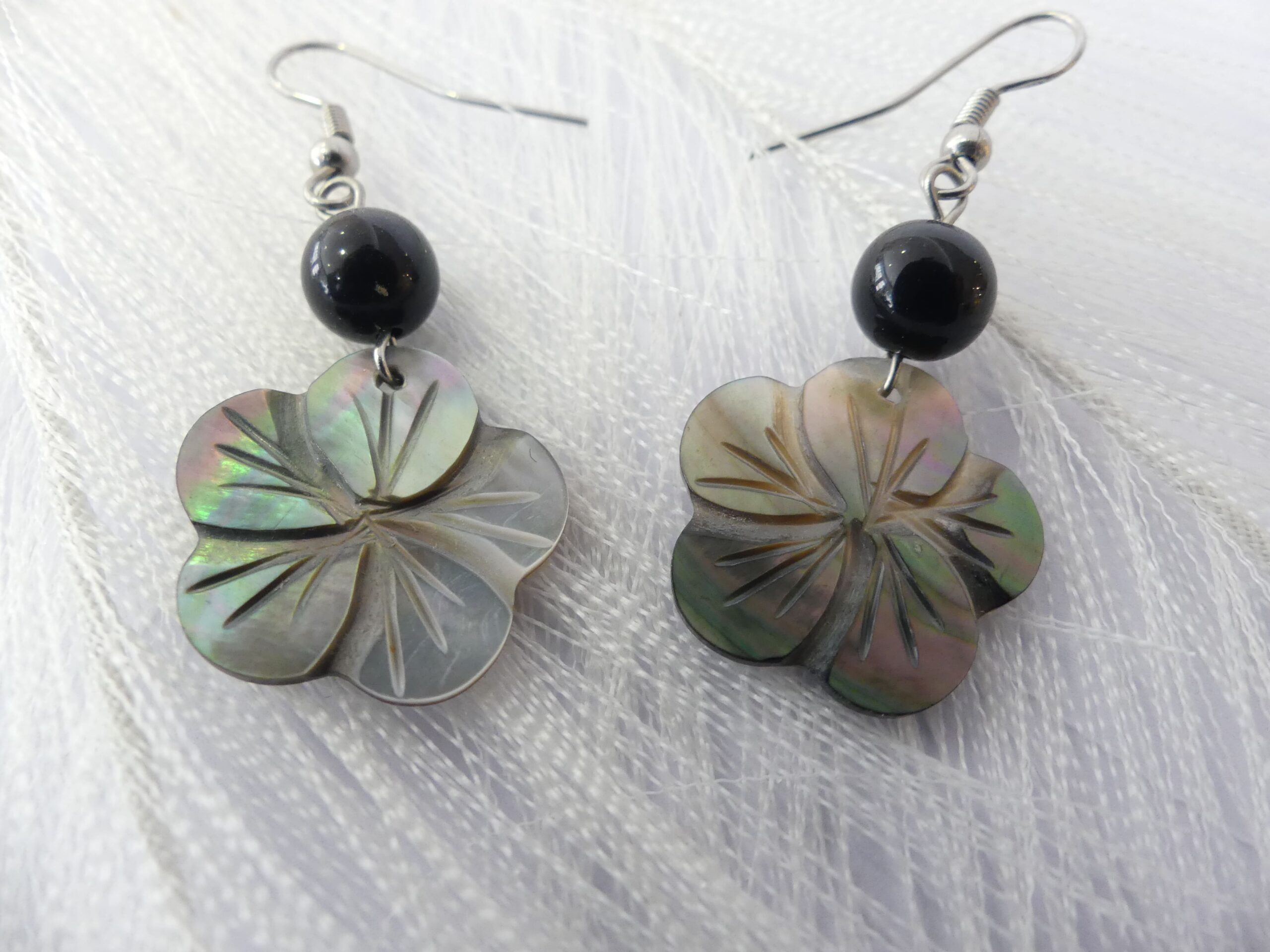 Fleur en nacre grise avec des reflets et perle noire en en verre de 2 cm de diamètre