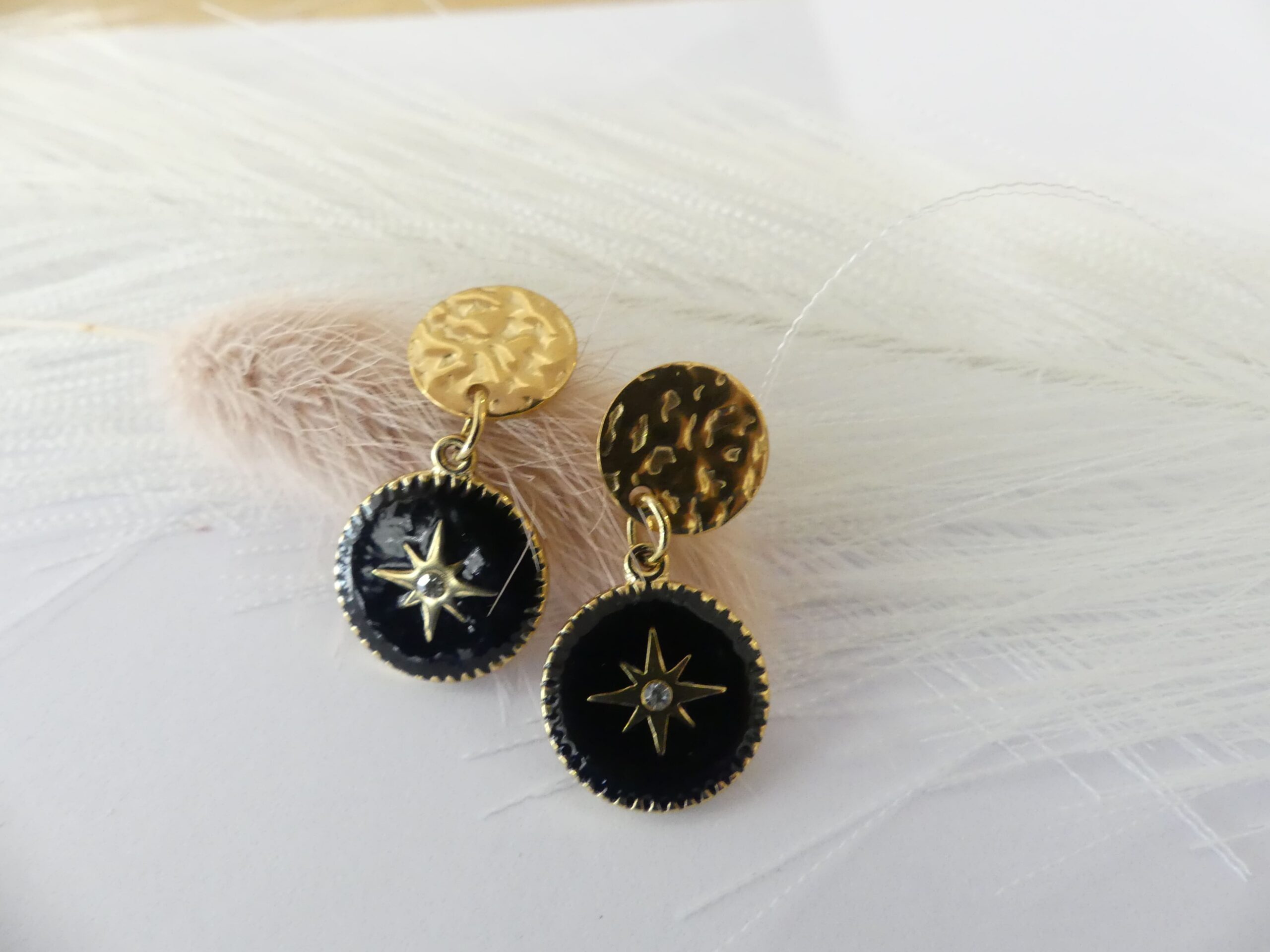 Attaches en acier avec une pastille martelée à laquelle est accroché une pastille noire et dorée avec un motif d'étoile dorée et un strass