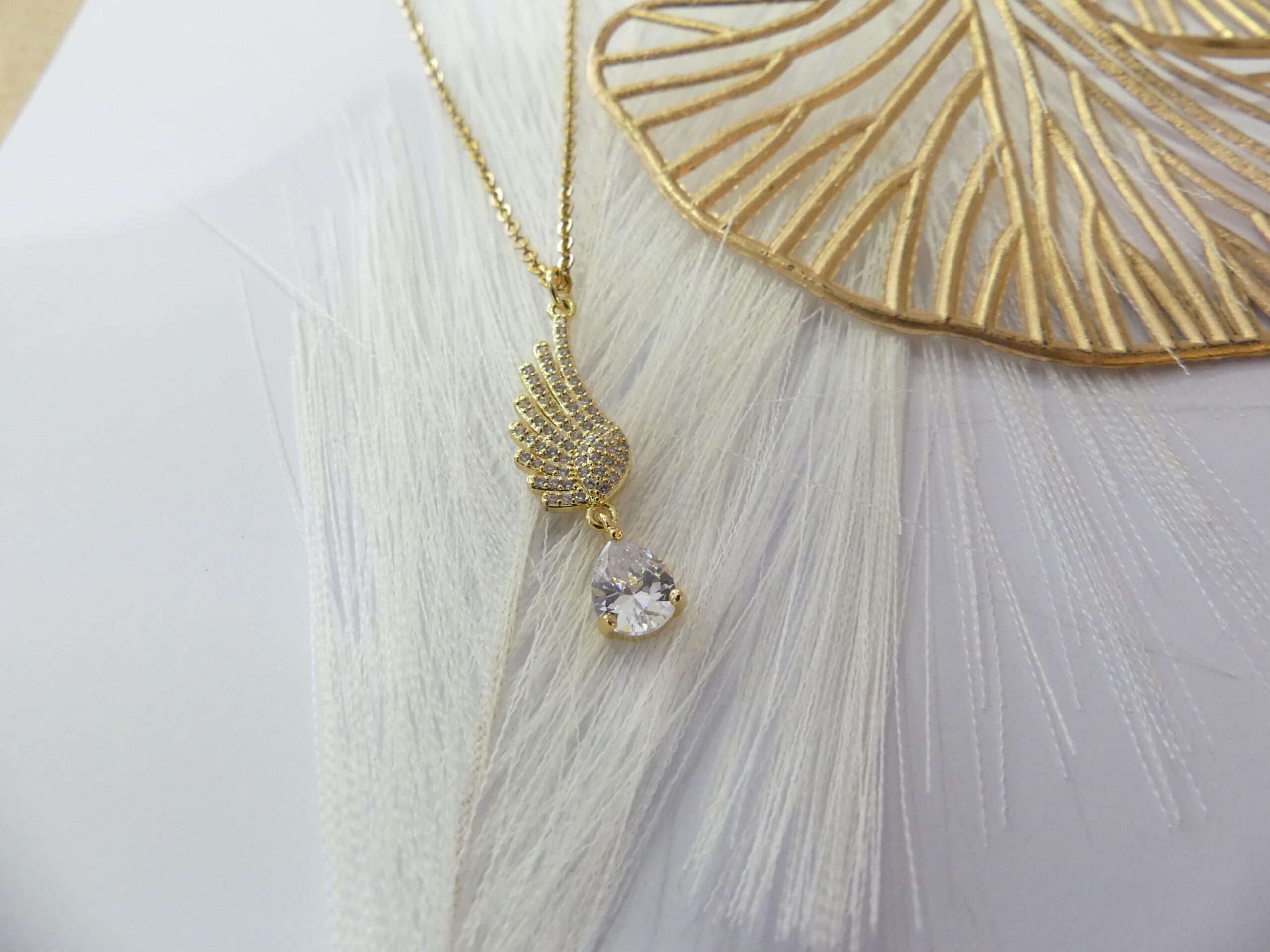 chaine en acier dorée avec un pendentif en aile d'ange sur lequel sont insérés des strass et un pendant cristal en forme de goutte