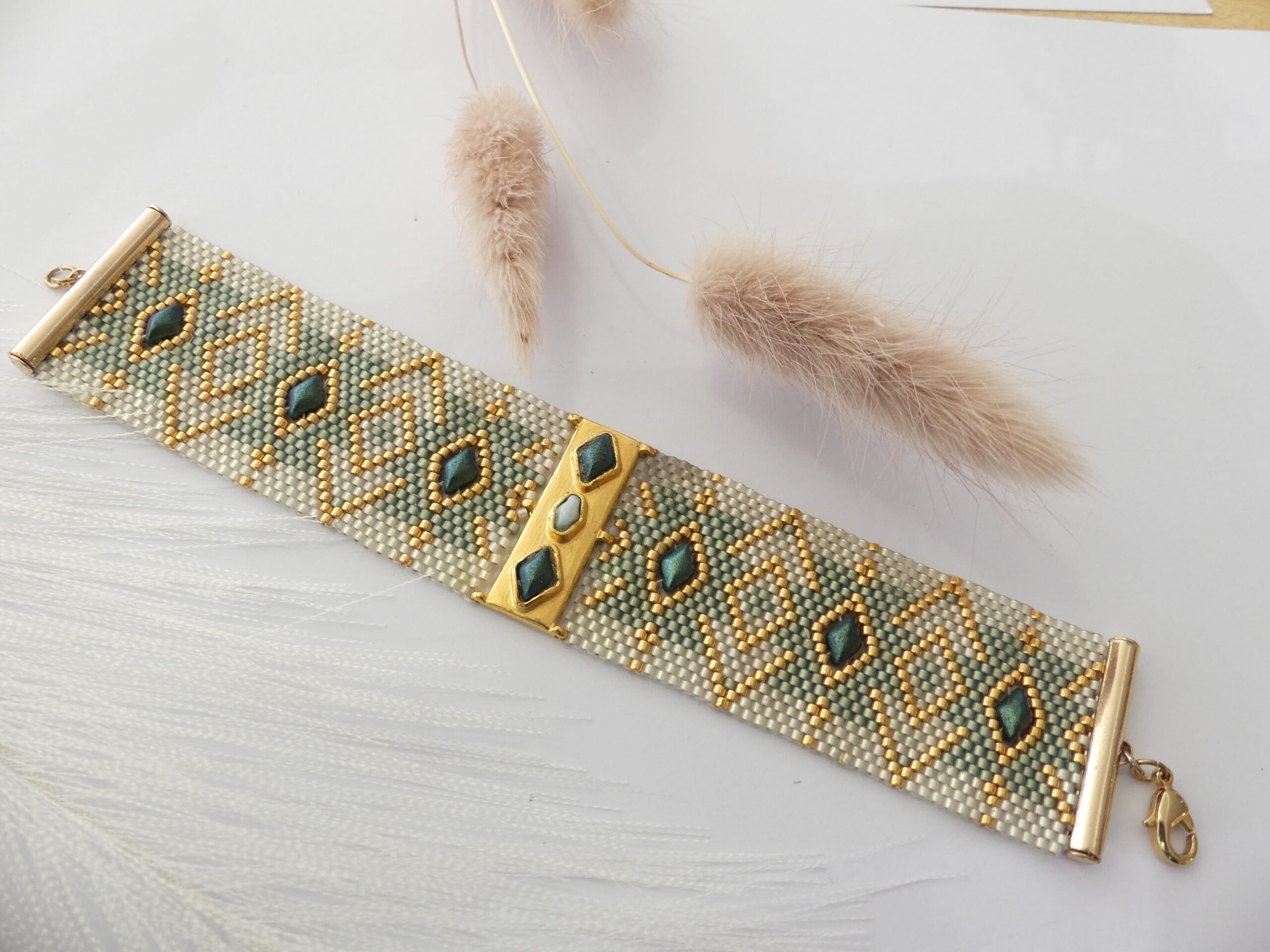 bracelet vert et doré large de 3 cm en perles japonaises tissées plus 1 barrette doré centrale incrustée de perles. Les perles sont vertes, crème et dorées. Il se ferme avec un fermoir mousqueton